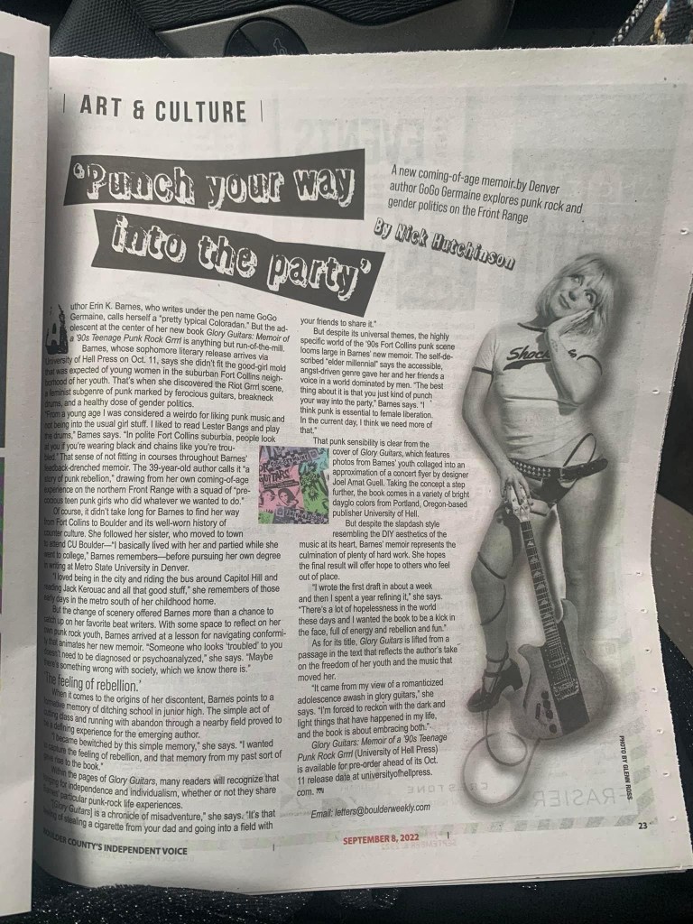 Gogo Germaine is go-going on the road. Glory Guitars, her punk coming-of-age memoir that is slated for release Oct 11, has already graced the cover of Boulder Weekly and was described as “if Howl had been written by a 15-year-old fanzine writer high on life, booze and illicit pharmaceuticals” by UK music site Louderthanwar. Celebrate with her at the following book launch parties: